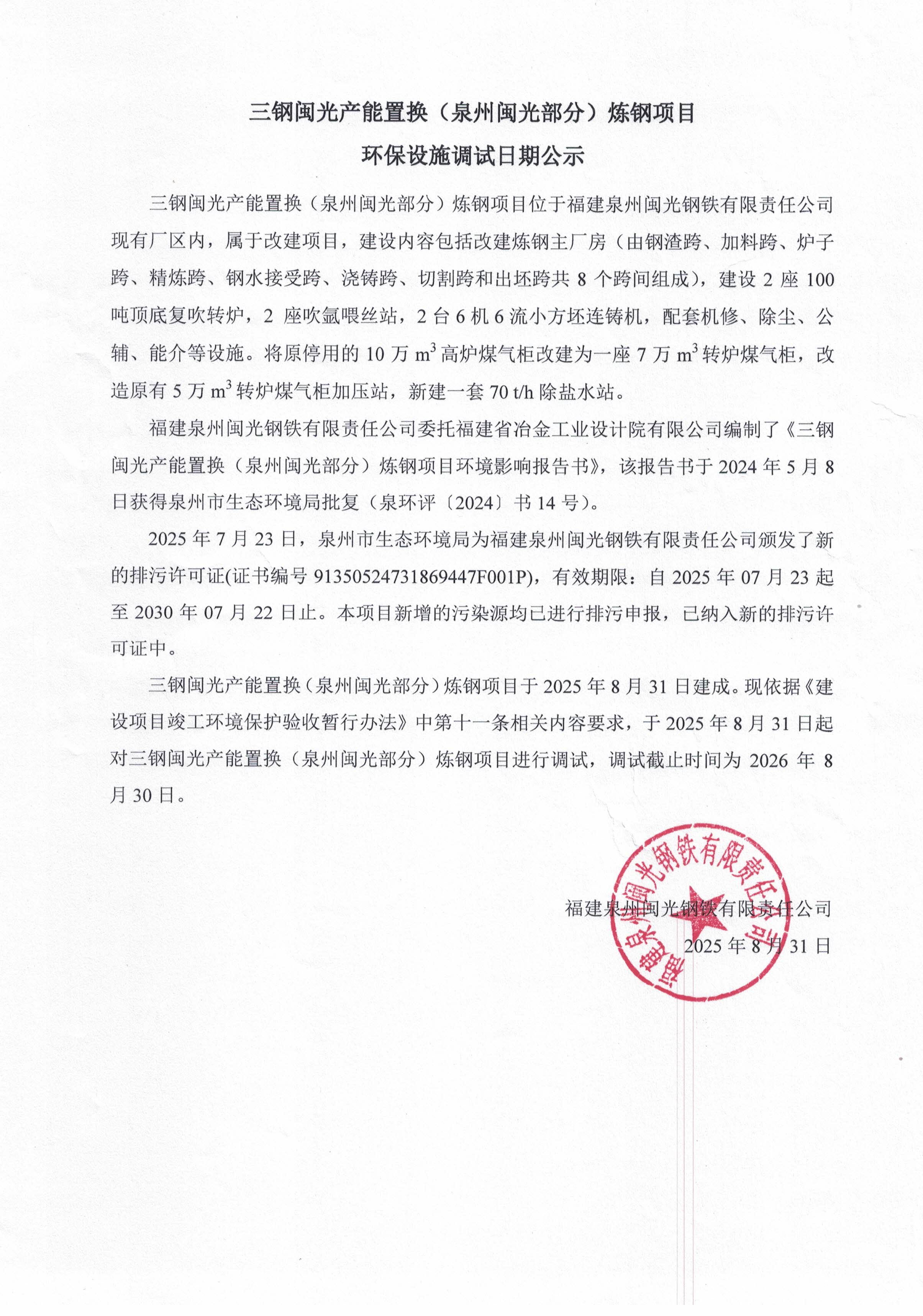 三鋼閩光產(chǎn)能置換(泉州閩光部分)煉鋼項目環(huán)保設施調(diào)試日期公示