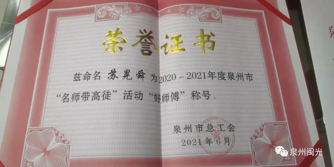 日前,動(dòng)力廠蘇晃舜同志被泉州市總工會(huì)授予2020-2021年度泉州市“名師帶高徒”活動(dòng)“好師傅”稱號(hào)。